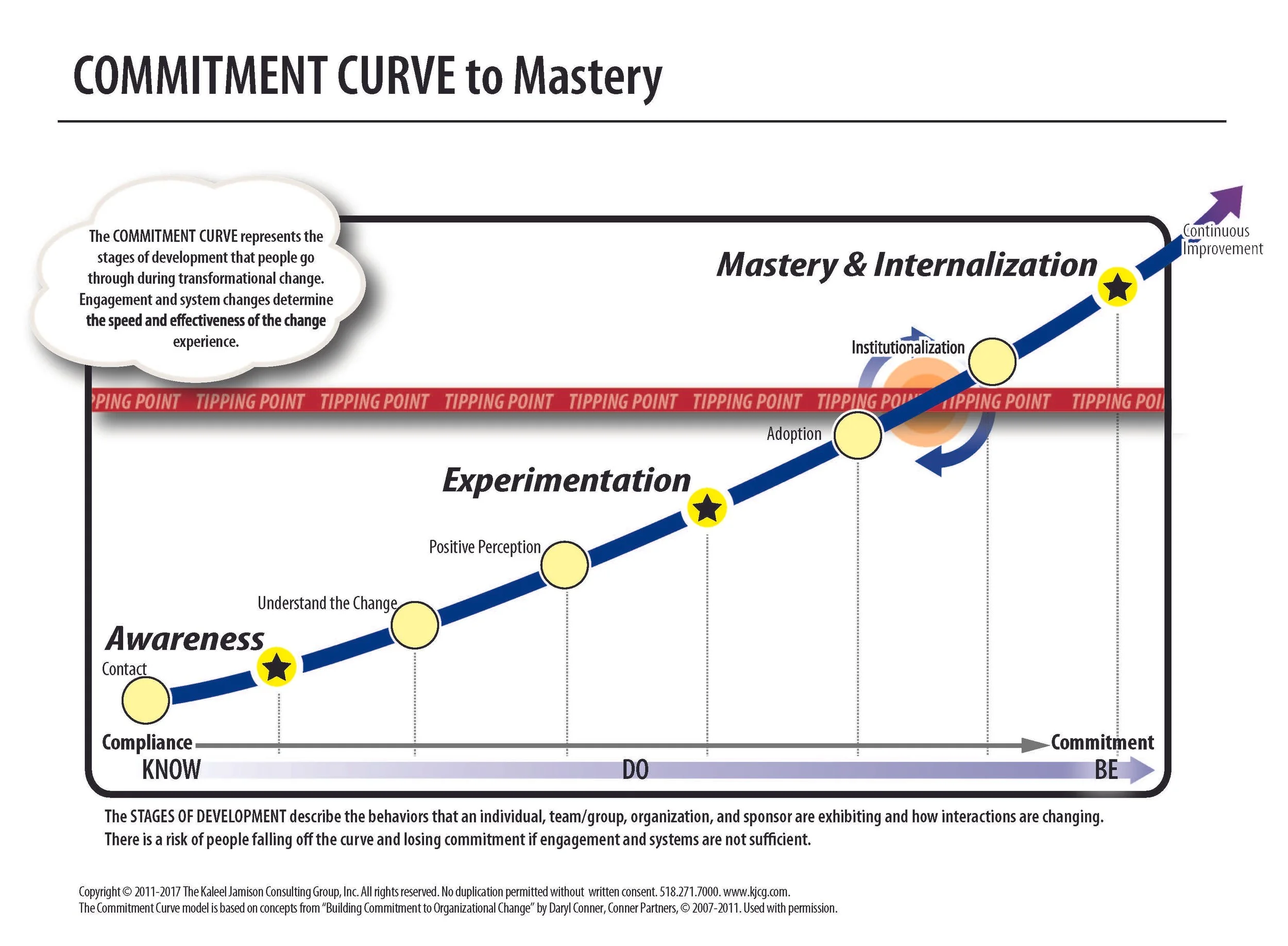 Internal change agents must not move too far up the Commitment Curve vis-à-vis the rest of the system. Being “out of sight of the pack” often leaves change agents feeling vulnerable and alone. Their own momentum up the curve, and the creation of critical mass within their own organization, are at risk without senior leader sponsorship, strong leaders from their function, and a community of others practicing the new behaviors. This highlights the value of Communities of Practice, which bring change agents and early adopters together for mutual support.